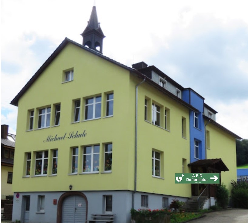 Der Defibrillator befindet sich gegenüber des Lehrerparkplatzes an der Rückwand des Eingangsbereiches zu den Wohnungen.